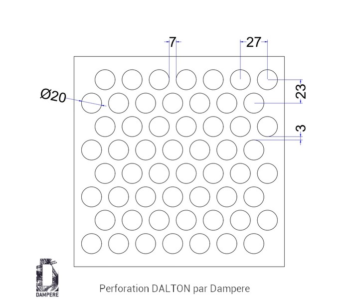 Le motif perforé R20T27 – Dalton se comprend comme une grille de justesse. Chaque ouverture est une mesure : ni trop, ni trop peu. L’équilibre des pleins et des vides dessine une matière fiable, rassurante, naturellement géométrique. L’architecte y trouve un module stable, facile à calepiner sur de grandes surfaces. Le métallier y voit une tôle perforée polyvalente, robuste et simple à travailler. L’agenceur y lit une texture de façade claire, ouverte, capable de dialoguer avec la lumière naturelle ou artificielle. Le conseil de l'équipe