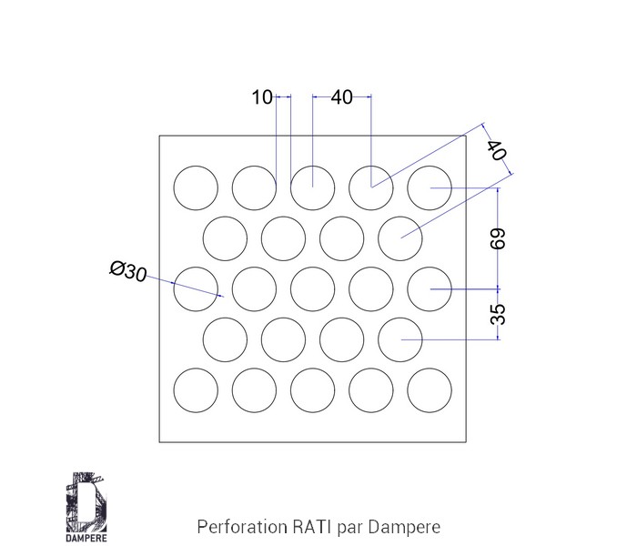 La tôle perforée R30T40 s’utilise en clôture urbaine ou en habillage de site semi-ouvert, créant un filtre respirant qui laisse passer la lumière et l’air sans obstruer la vue. En voile de protection d’escalier ou de passerelle, la perforation Rv30-40 répond aux exigences de sécurité tout en favorisant la transparence et la continuité du paysage. La tôle garantit : – la solidité nécessaire à un usage extérieur intensif, – une transparence confortable qui relie intérieur et extérieur, Le motif rond et ample confère à la tôle une expression équilibrée, adaptée aux bâtiments collectifs, aux équipements tertiaires ou sportifs et aux projets d’aménagement urbain. Sa géométrie régulière et la justesse de ses proportions facilitent le calepinage architectural. L’alignement diagonal des perforations rend la tôle lisible sous tous les angles, et sa texture ronde adoucit les contrastes. L’architecte urbaniste y trouve une matière équilibrée et lumineuse pour composer des façades respirantes. Le métallier y voit une tôle fiable, résistante et facile à manipuler, adaptée à de nombreuses configurations de pose. L’agenceur de mobilier intérieur y reconnaît une surface rythmée et fluide, capable d’organiser l’espace tout en préservant la clarté des volumes. La tôle perforée R30T40 – Rati associe ouverture, stabilité et équilibre visuel. Son motif rond de 30 mm en disposition quinconce forme une grille régulière et harmonieuse offrant une transparence > 50 %, idéale pour les applications qui recherchent à la fois une forte aération et une présence visuelle structurée. Cette perforation classique de type Rv30-40 s’impose dans les architectures contemporaines ouvertes : séparatifs d’équipements publics, parements de façades ventilées, enveloppes techniques ou structures métalliques décoratives.