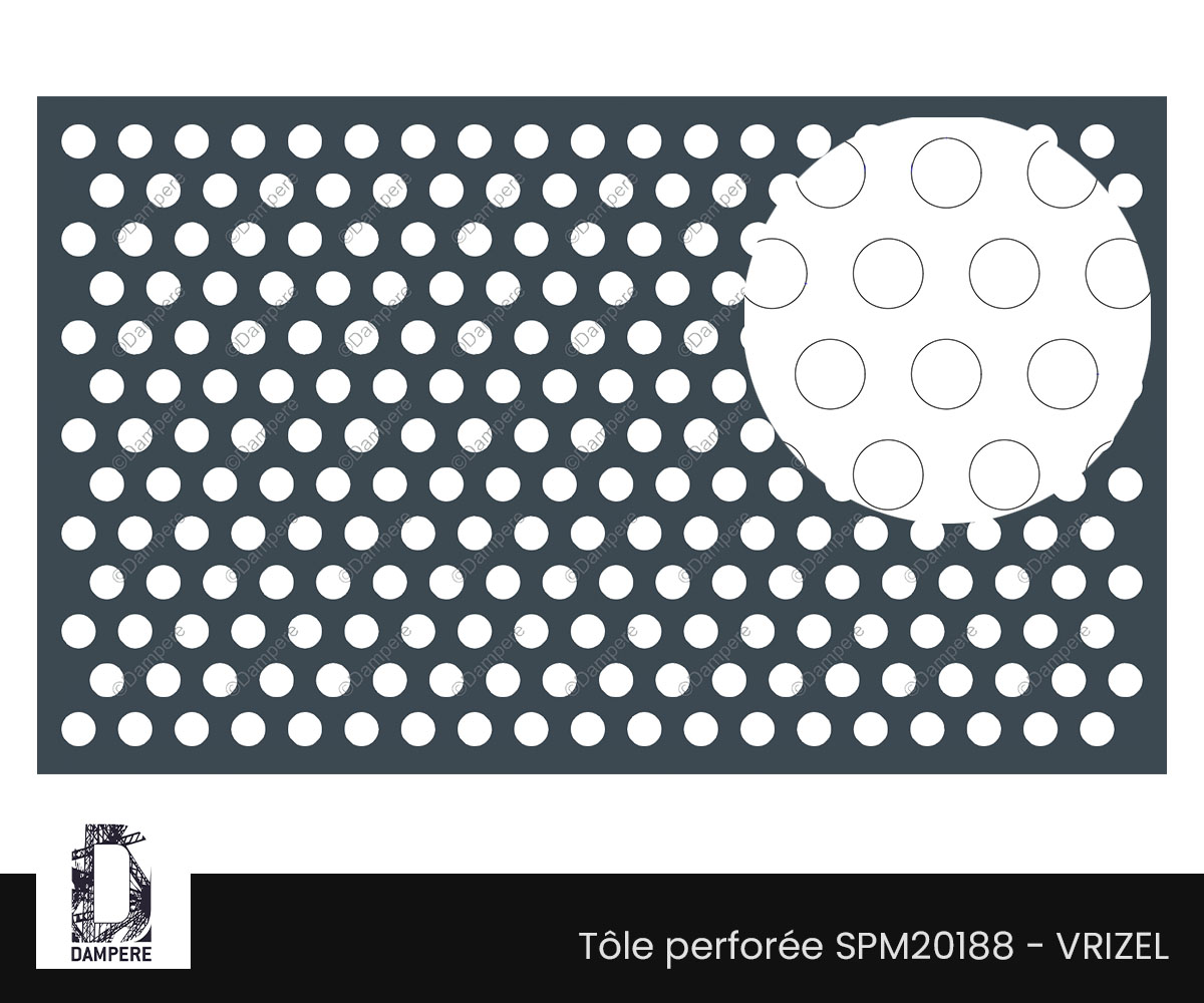 La tôle perforée Vrizel s’utilise pour les garde-corps, les clôtures, les parements de façades ventilées, les enveloppes de parkings ou les protections d’équipements publics. Son motif rond de grand diamètre favorise la circulation de l’air et la diffusion naturelle de la lumière, tout en créant un effet visuel doux et rythmé. En disposition quinconce, le dessin évite la rigidité des alignements et apporte une impression de mouvement équilibré. Cette tôle ajourée se prête particulièrement aux projets où la transparence et la respiration visuelle doivent s’accorder à la robustesse du métal.