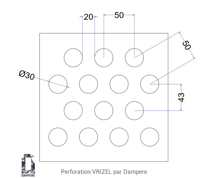 La tôle perforée R30T50 Vrizel propose une écriture visuelle aérée et mesurée : des ronds perforés de Ø 30 mm agencés en quinconce sur un pas constant de 50 mm. Sous la désignation de tôle perforée standard Rv30-50, cette géométrie perfo délivre un vide proche de 33 %, un niveau équilibré quand l’objectif est d’assurer un passage d’air utile, une transmission lumineuse confortable et un masquage raisonnable de l’arrière-plan. Le réseau de perforation triangulaire garantit une répartition uniforme des ouvertures : le tramage d’ombres demeure doux et peu directionnel ; en lecture lointaine, la surface s’apparente à un voile métallique régulier et respirant.