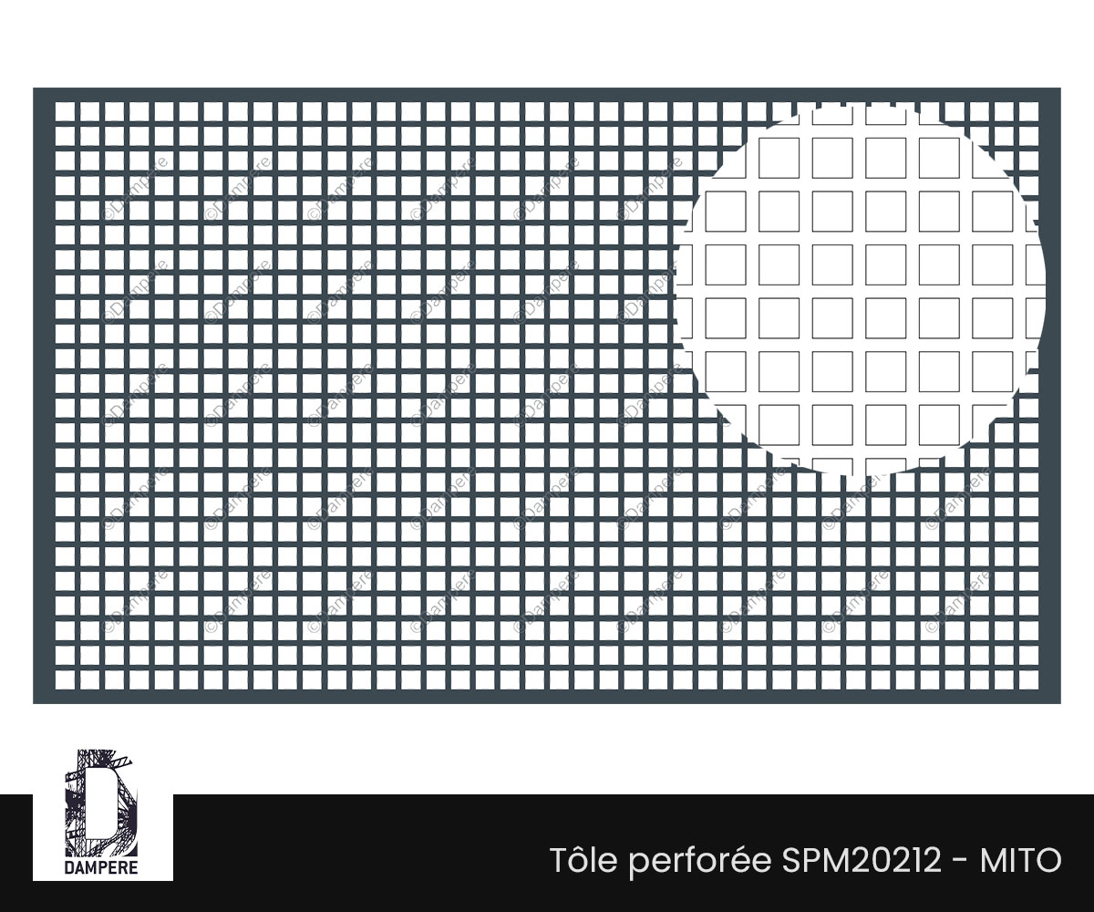 La tôle perforée C18U24 – Mito impose sa présence avec sobriété et efficacité. Composée de trous carrés de 18 mm de côté, alignés en trame droite selon un entraxe de 24 mm, elle dessine une grille géométrique rigoureuse nommée Qg18-24, offrant une transparence de 56 %, équilibré entre transparence et disposition de trou.