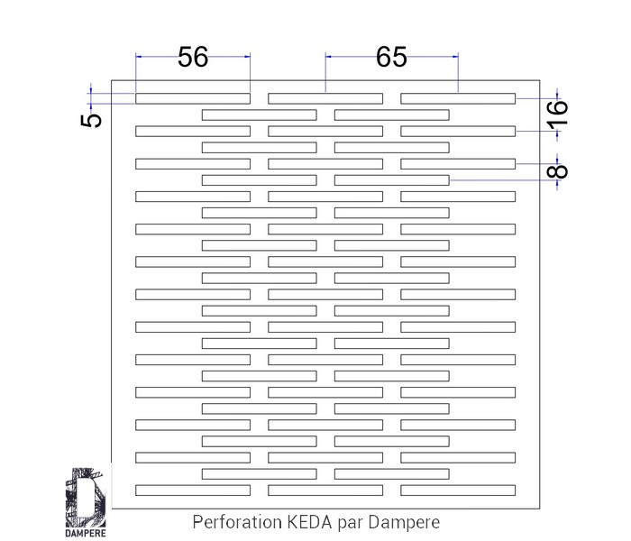 La tôle perforée REC 5×56 Z 8×65 – Keda propose une écriture de la résille métallique étirée et très respirante : des trous rectangulaires de 5×56 mm, disposés en quinconce sur un pas de 8 mm dans la petite direction et 65 mm dans la grande donnent une belle illusion optique. Dans cette géométrie perforation régulière, le vide opérationnel dépasse 60 %, un niveau élevé de transparence lorsque l’objectif recherché est d’assurer un fort passage d’air dans un mécanisme de ventilation, une transmission lumineuse généreuse d'un brise vue et un allègement visuel marqué de l’enveloppe du Bâtiment. La disposition décalée en "Z" de la tôle perforée homogénéise la diffusion des ouvertures et adoucit les formes pour activer l'effet de mirage : en lecture lointaine, la surface perforée se perçoit comme un voile métallique très aéré, tandis que de près, le trou rectangulaire allongé dessine une trame fine et directionnelle.
