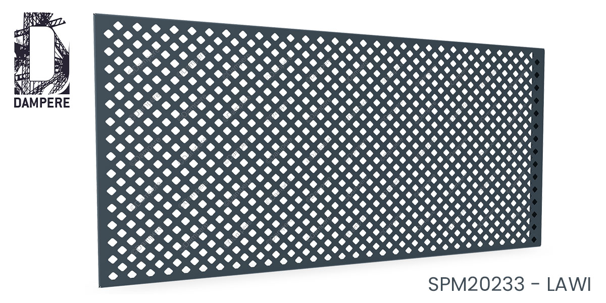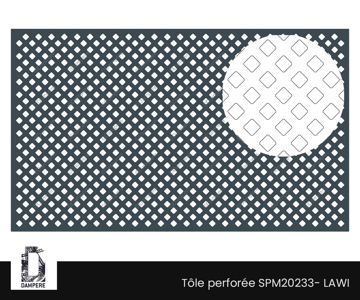 La tôle perforée CD15M38 – Lawi propose une écriture géométrique décorative et apaisée : des trous carrés de 15 mm aux angles adoucis, disposés en quinconce (maille à répétition triangulaire) sur un module de 38 mm. Dans ce moucharabieh perforé géométrie de perfo, le vide opérationnel se situe autour de 19 %, un niveau mesuré lorsqu’il s’agit d’assurer un passage d’air utile, une transmission lumineuse maîtrisée et un rendu visuel soigné. L’orientation “sur pointe” confère au motif une texture élégante : à distance, la surface se lit comme un voile métallique régulier ; de près, les facettes arrondies adoucissent les ombres et évitent la dureté d’un carré strict.