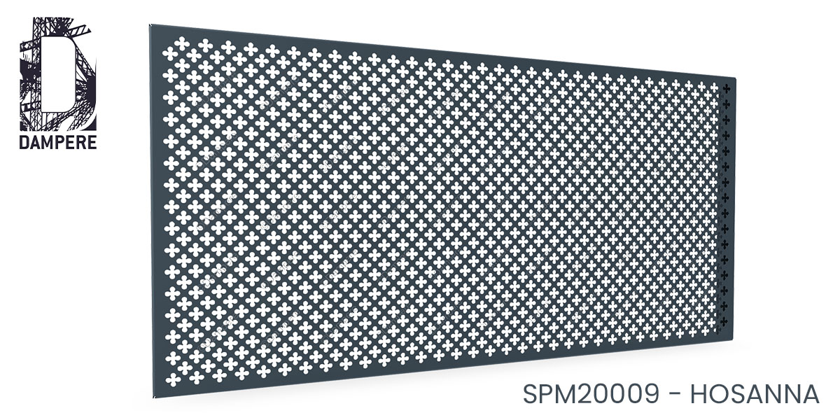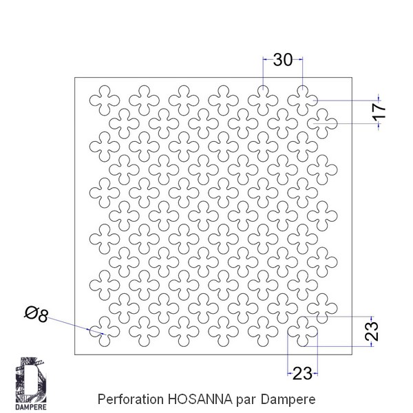 Tôle perforée HOSANNA présente un décor des trèfles isométriques disposés en quinconce. Grille de perforation présentant des bandes résiduelles formant des croix crantées.