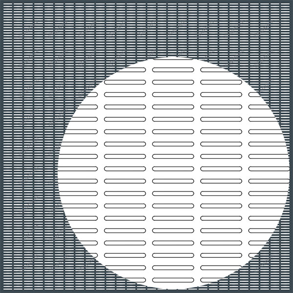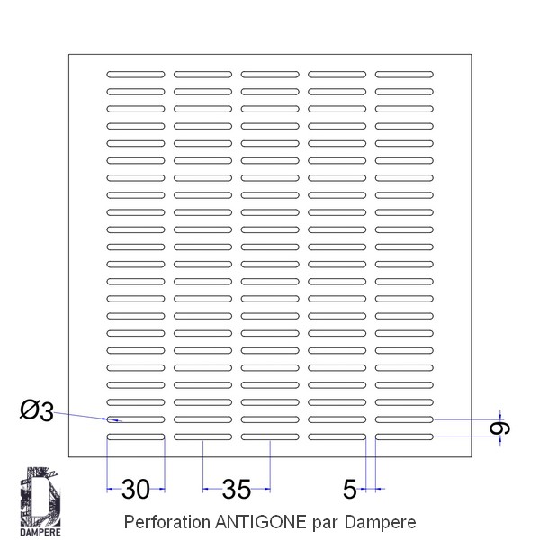 La tôle perforée pour ventilation Antigone a des trous oblongs de 3x30 mm alignés selon une grille orthogonale standard LR3x30 U 9x35, qui forment une perforation classique.