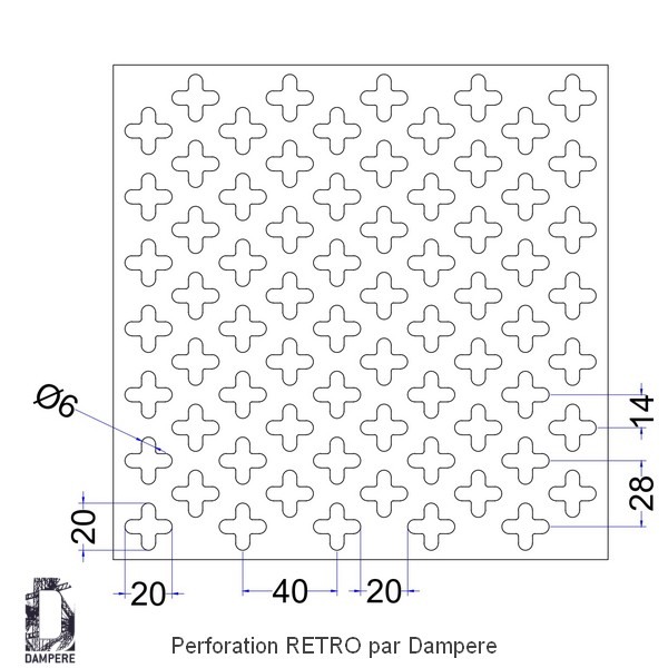 Tôle perforée Retro patrimoine composée de trous cruciformes aux sommets ronds, disposé en diagonales pour créer un motif répétitif
