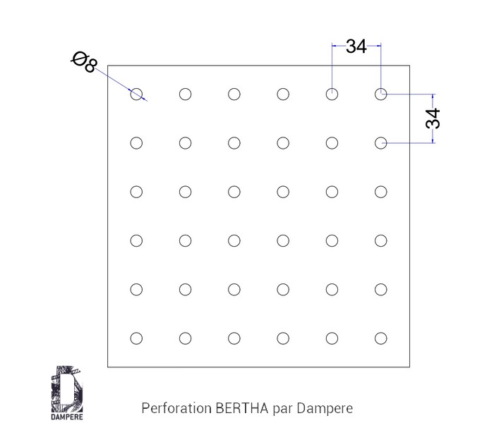 La tôle perforée BERTHA – R8U34 privilégie la protection visuelle et la robustesse. Elle est composée de trous ronds Ø 8 mm, disposés en alignement orthogonal (trame en ligne droite) sur un pas régulier de 34 mm. Référencée Rg8-34, cette géométrie perforée développe une transparence très faible, de l’ordre de 4,3 % (≈50,3 mm² d’ouverture pour 1 156 mm² de maille), idéale lorsque l’objectif est d’occulter largement tout en autorisant une légère ventilation et un discret passage de lumière.