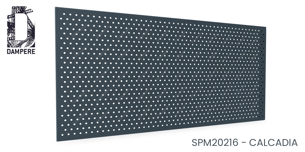 La trame en quinconce répartit les ajours de façon isotrope, générant des ombres souples et peu directionnelles. De loin, la perfo R8T25 Calcadia se lit comme une peau presque pleine, homogène et apaisée ; en vue de près, le disque de 8 mm crée un pointillé discret, maîtrisé, sans dureté graphique. Ce motif ajouré convient lorsque l’on cherche une écriture technique sobre et protectrice : façades secondaires à faible transparence, capotages et coffrages d’équipements, clôtures semi-occultantes, écrans anti-regard, habillages de locaux sensibles.