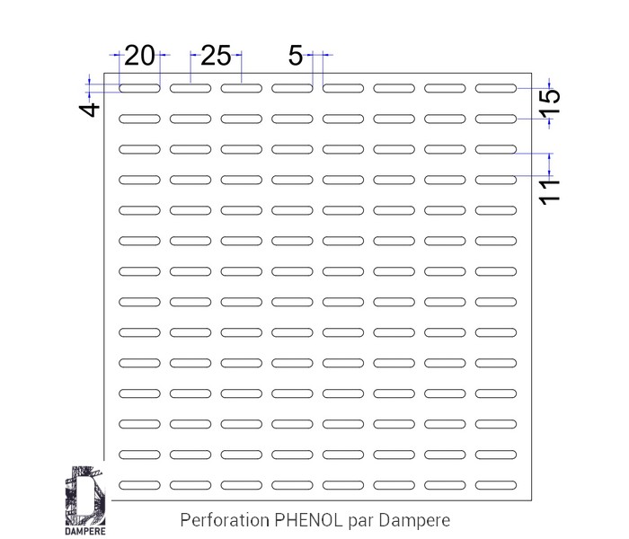 La tôle perforée Phenol avec un entraxe en grille orthogonal en U 15×25 mm et un vide par ajour de 4×20 mm, les ponts de matière atteignent environ 11 mm dans la petite direction (15 – 4) et 5 mm dans la grande (25 – 20). La trame orthogonale confère un comportement légèrement plus directionnel qu’une maille décalée ; la ligature longitudinale de 5 mm exige néanmoins de la rigueur :