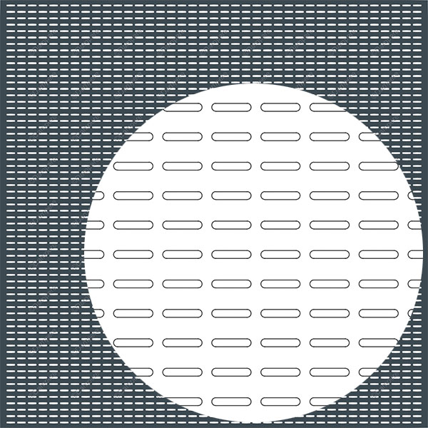 La tôle perforée LR 4×20 U 15×25 – Phenol propose un graphisme de grille allongée; par des ajours oblongs de 4×20 mm, disposés en alignement orthogonal parfait sur un pas de 15 mm dans la petite direction et 25 mm dans la grande. Dans cette géométrie de grille perforée, le vide est d’environ 18 %, niveau adapté lorsque l’on souhaite combiner passage d’air utile, apport lumineux ajusté et lecture visuelle calme. À la différence d’une grille perforée en maille décalée de type "z", la grille en ligne produit un quadrillage de type "U" demeure très lisible : les ombres s’organisent en bandes régulières, avec un effet de grille orthogonale plus marqué selon l’orientation.