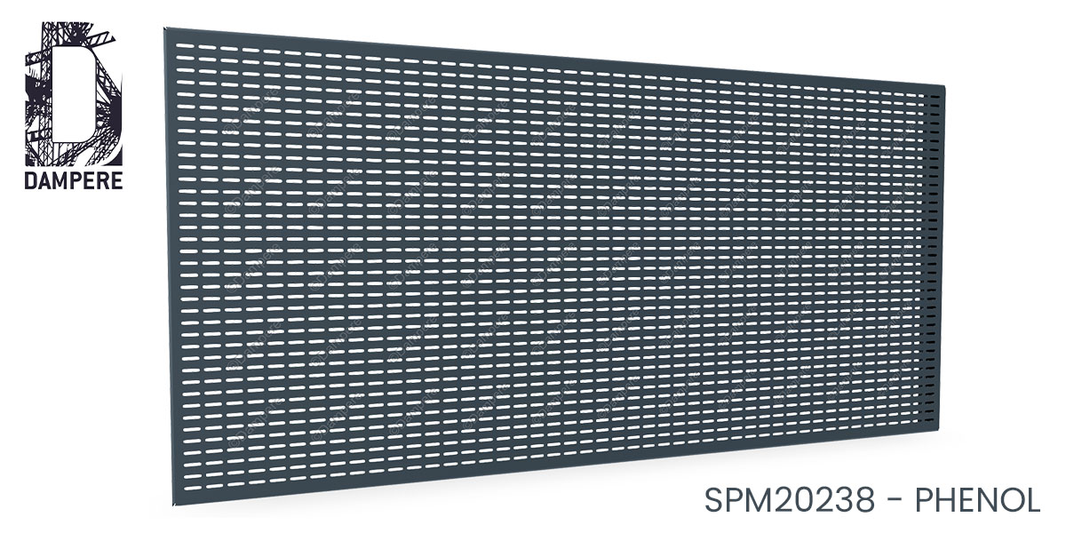 La tôle perforée Phenol s’impose également comme un matériau d’habillage fonctionnel : caches de ventilation, parements de gaines, clôtures techniques ou protections d’équipements. Son motif en ligne évoque la précision industrielle, tout en s’intégrant aisément dans des compositions architecturales sobres et rythmées.