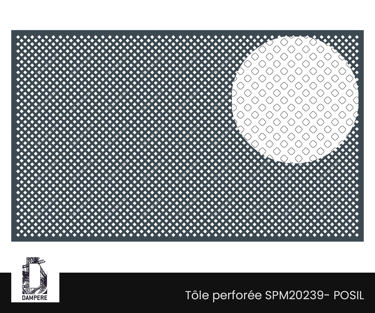 La tôle perforée CD8M20 – Posil propose une écriture géométrique précise et décorative : des trous carrés de 8 mm aux angles adoucis, disposés en quinconce à 45° “sur pointe”, sur une maille à répétition triangulaire de 20 mm. Dans cette géométrie de perfo, le vide opérationnel se situe autour de 20 %, un niveau mesuré lorsqu’il s’agit d’assurer un passage d’air utile, une transmission lumineuse maîtrisée et un rendu visuel soigné. L’orientation en pointe de diamant ou disposition carré sur pointe, crée une texture graphique élégante ; à distance, la surface se lit comme un voile métallique régulier, tandis que de près, les facettes arrondies adoucissent les ombres et évitent la dureté d’un carré strict.